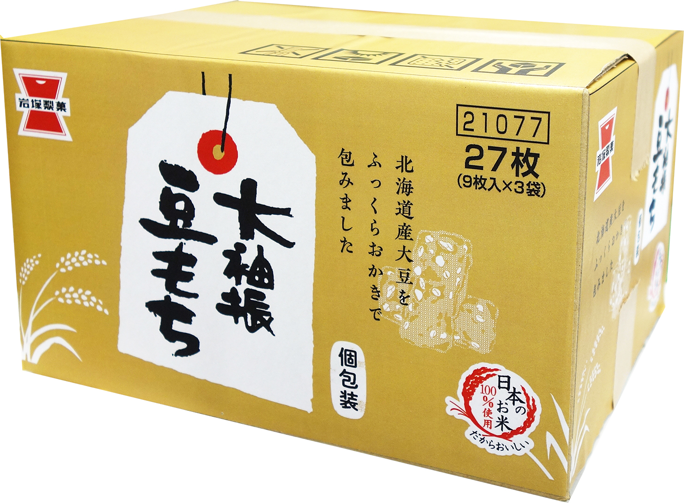 | 原材料名 | 水稲もち米(国産)、大豆、植物油脂、でん粉、食塩/調味料(アミノ酸等)、植物レシチン、(一部に大豆を含む) |