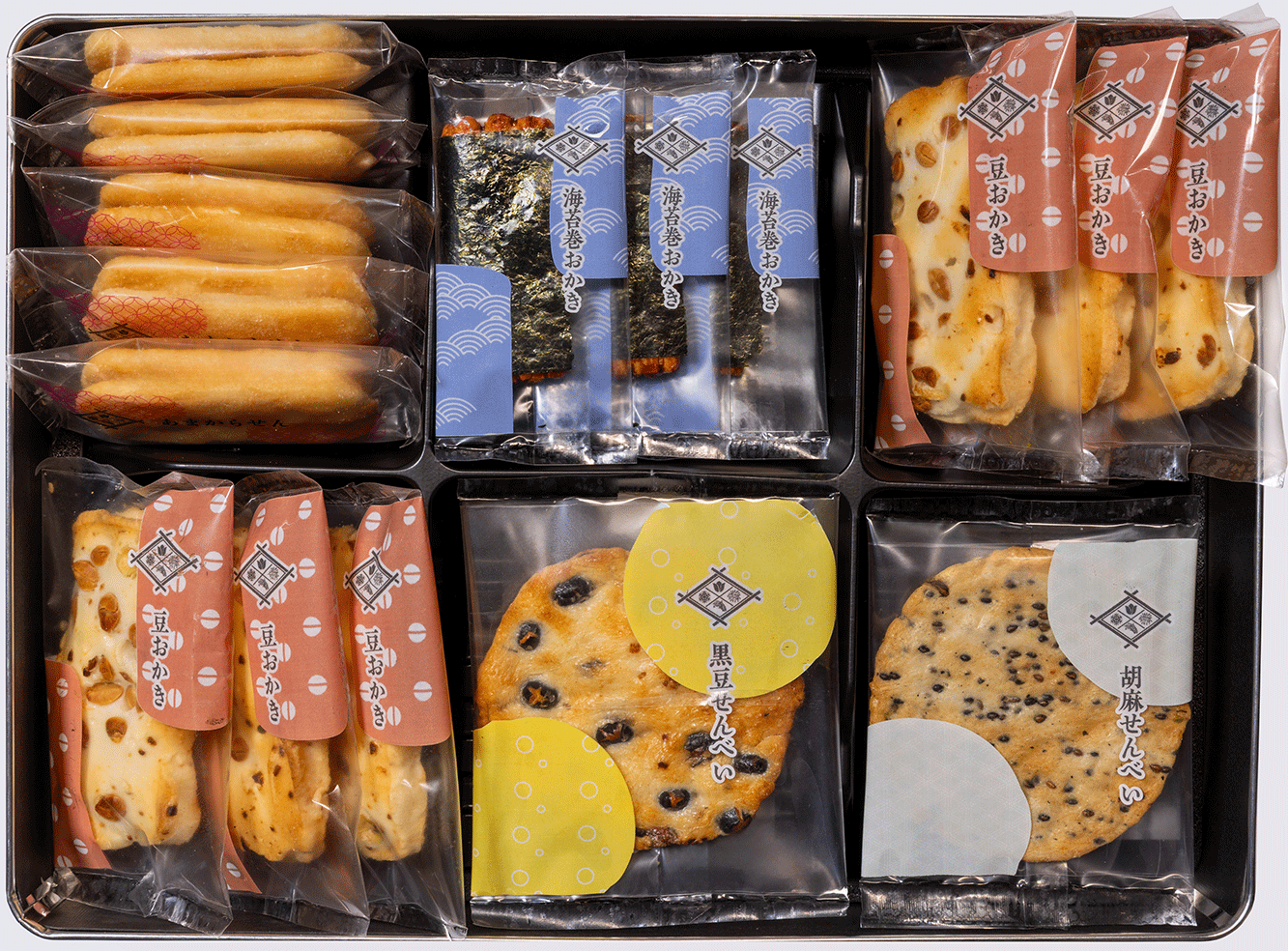 | 内容量 | あまからせん 2枚×5袋 黒豆せんべい 1枚×5袋 胡麻せんべい 1枚×5袋 海苔巻おかき 1枚×3袋 豆おかき 1枚×6袋 |