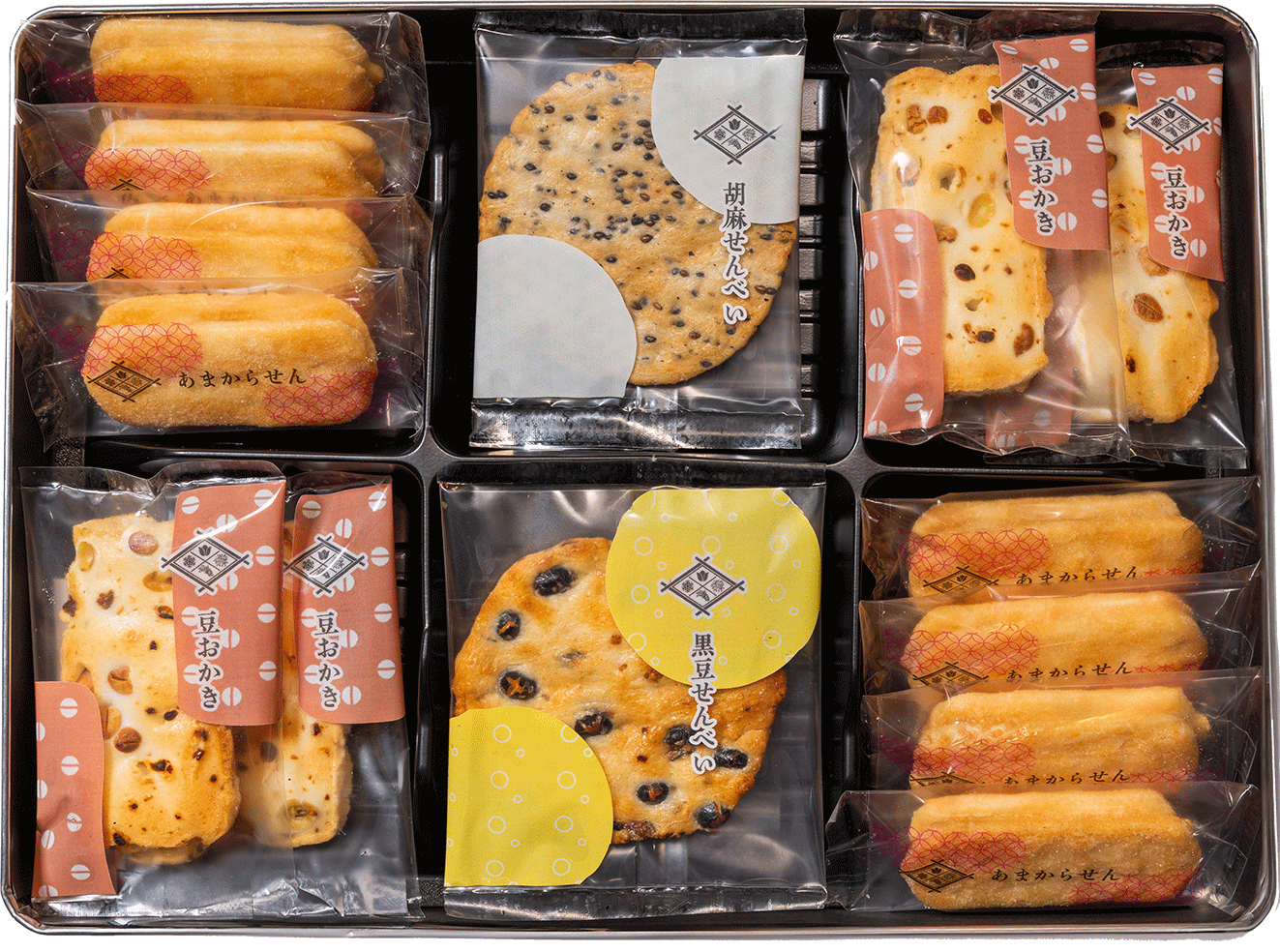 | 内容量 | あまからせん 2枚×8袋 黒豆せんべい 1枚×3袋 胡麻せんべい 1枚×3袋 豆おかき 1枚×4袋 |